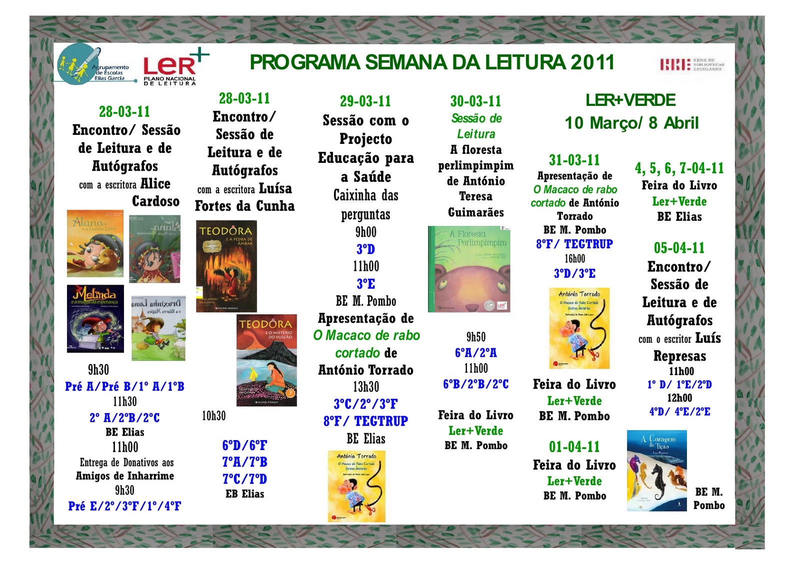 A biblioteca informa os pais de que no dia 5 de Abril de 2011 o autor Luís Represas se deslocará à escola para a apresentação e sessão de autógrafos do livro A CORAGEM DE TIÇÃO, publicado pela editora Dom Quixote.